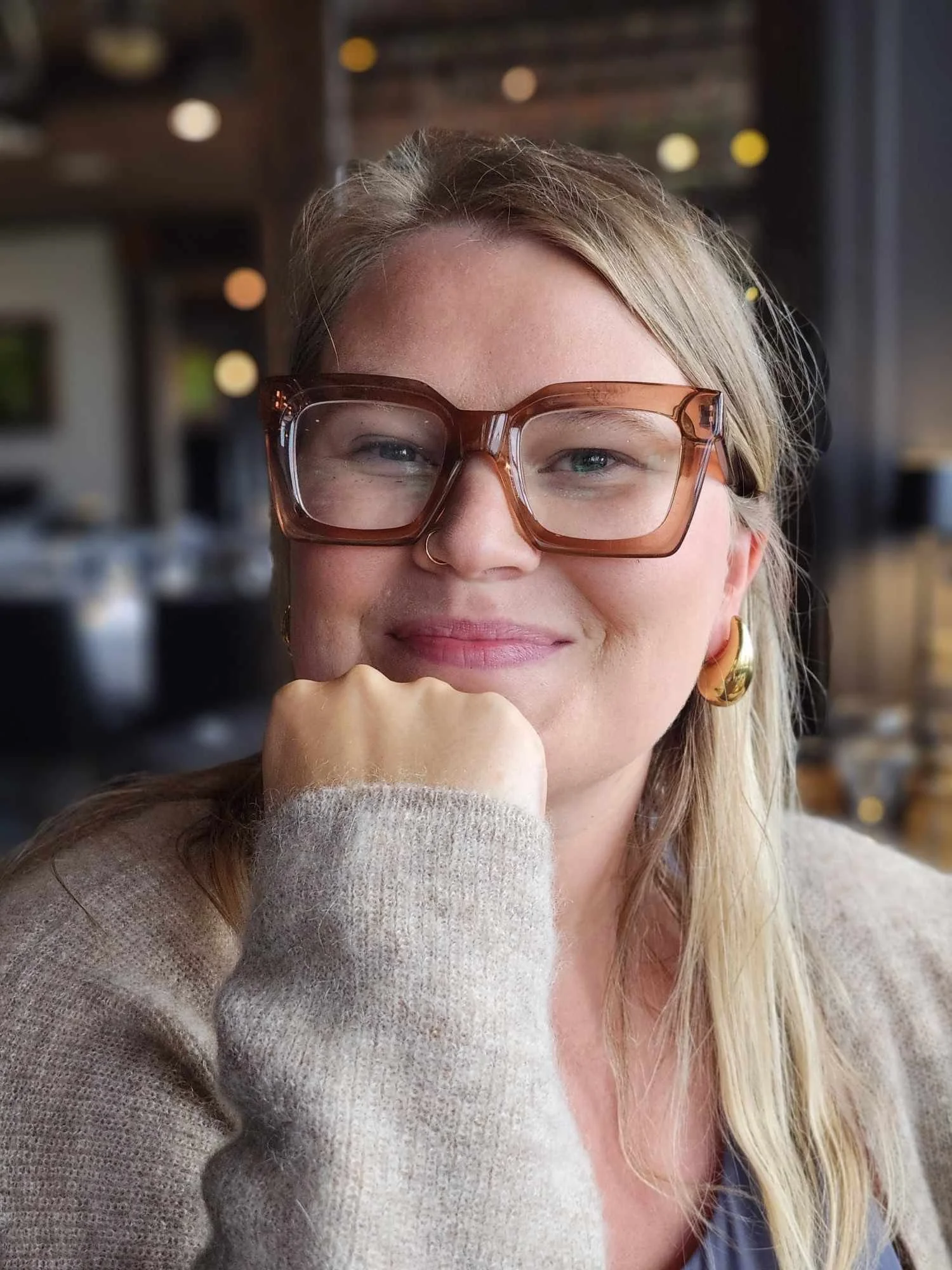 Image Description: Julian is sitting indoors, smiling gently with her chin resting on her hand. She wears square brown glasses, gold earrings, and a soft beige sweater. Her blonde hair is down, and she has a nose ring. The background is softly blurred with warm lighting.
