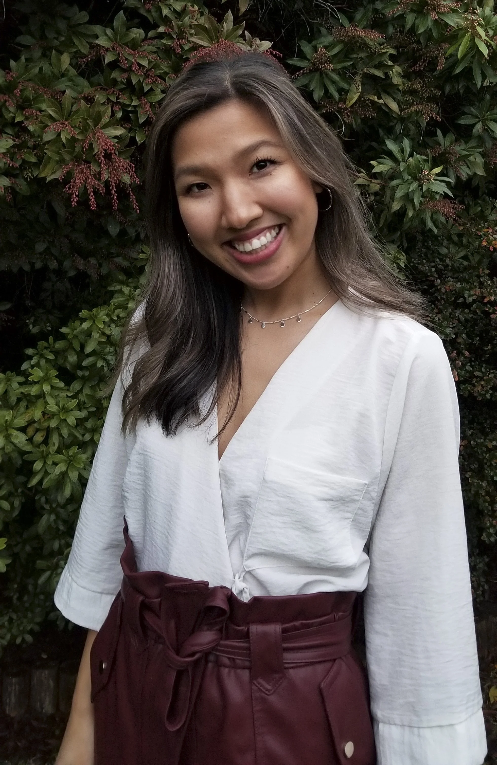 Image Description: Kaitlin is wearing a white long sleeve shirt and maroon leather pants. She is standing, centered in the middle of the frame, looking at the camera and smiling. The background is leaves with green and red accents.