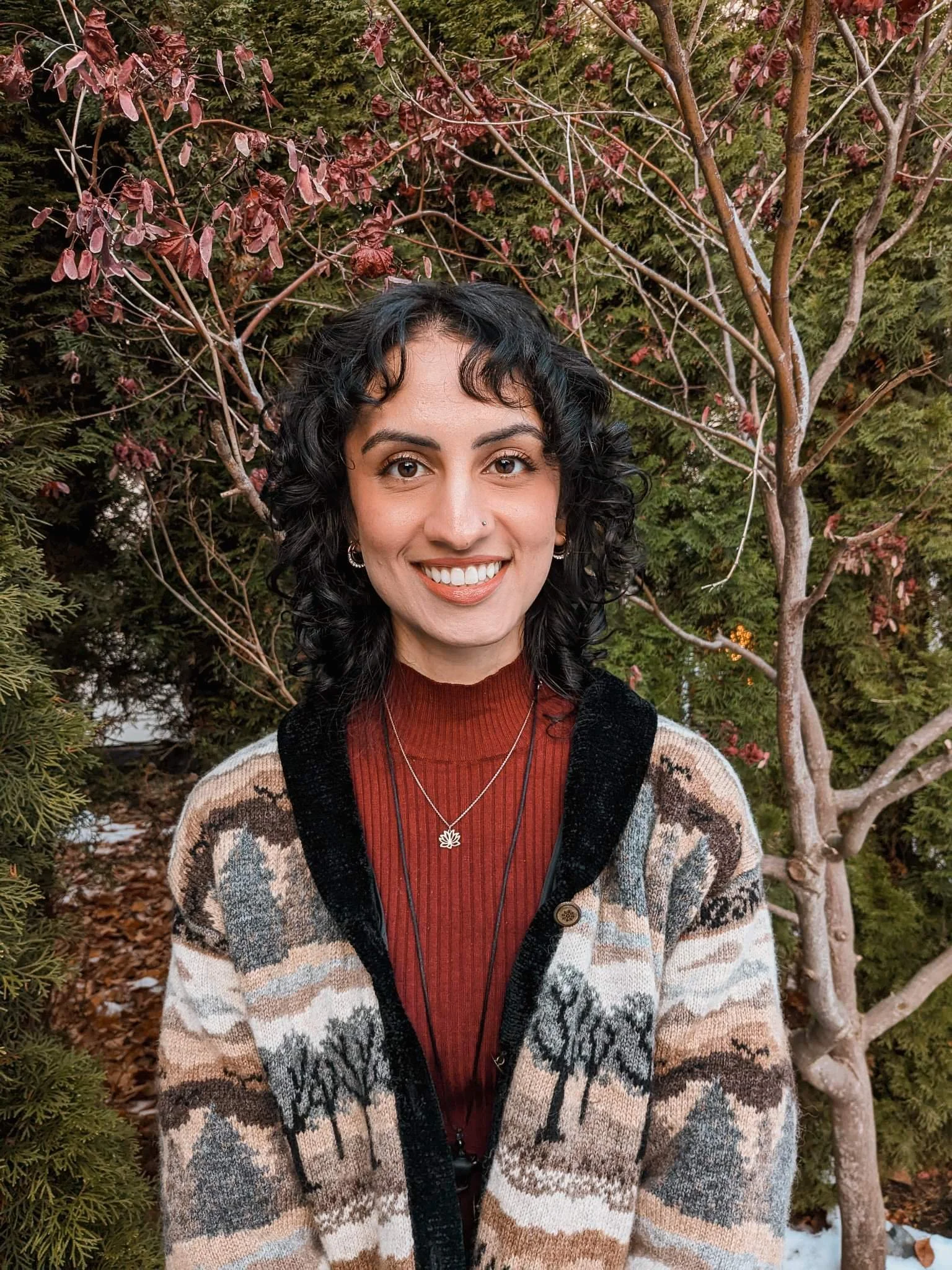 Image Description: Raman is standing centered outside, facing the camera and smiling. She has shoulder length, curly black hair and brown eyes. Raman is wearing a rust-coloured turtleneck with a multicoloured cardigan on top with outdoor winter patterns on it. Behind them is broadleaf tree with red leaves that looks to be a maple or Japanese maple.